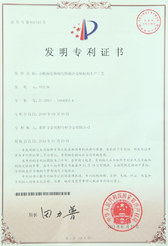 衡陽(yáng)市金則利特種合金股份有限公司成立于一九九九年十二月,注冊(cè)資本人民幣兩千兩百萬元。注冊(cè)地址:衡陽(yáng)市雁峰區(qū)白沙洲工業(yè)園長(zhǎng)塘路2號(hào)。公司主營(yíng)耐蝕軟磁合金,為湖南省高新技術(shù)企業(yè)。公司自成立以來,即致力于耐蝕軟磁合金的研發(fā)。 研制出的JL-31(00Cr13si2Pb)、JL-31B(00Cr13si2)、JL-31BS(00Cr13Si2S)、JL-37B(0Cr17Si2)、JL-37(0Cr17···